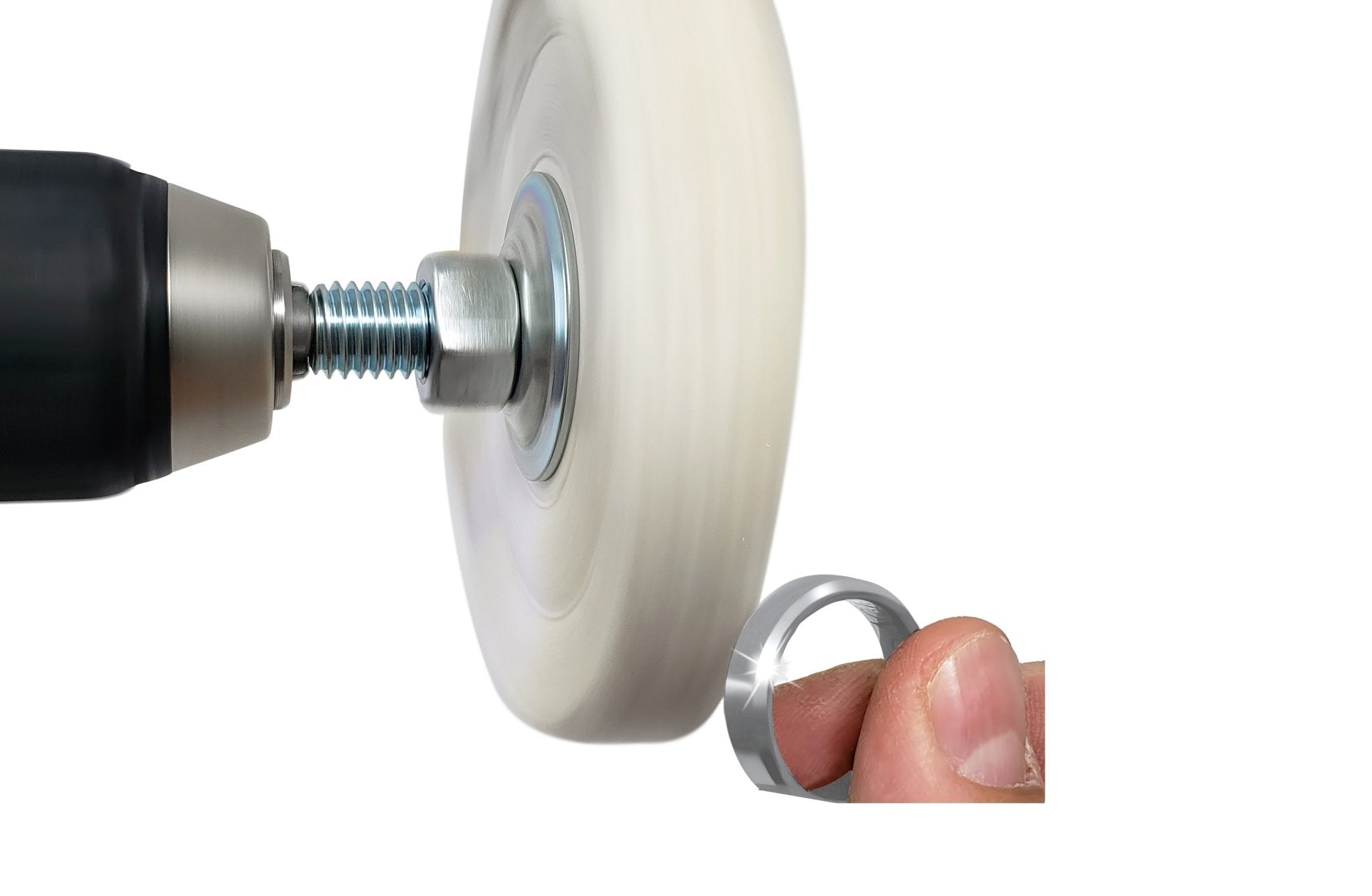 A conventional grinder or buffing machine, can sometimes be a little too powerful, runs at a high RPM and not very convenient to use. This arbor adapter solution allows for more versatility in your shop, especially if you need a slower and cooler operation speeds, or you simply prefer to use a cordless or electric drill for convenience or a drill press as a stationary option.