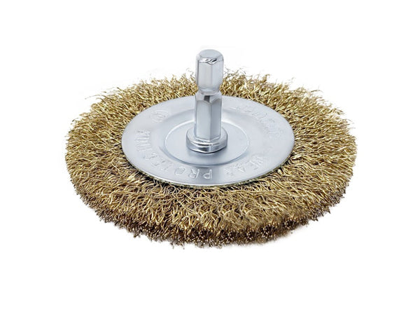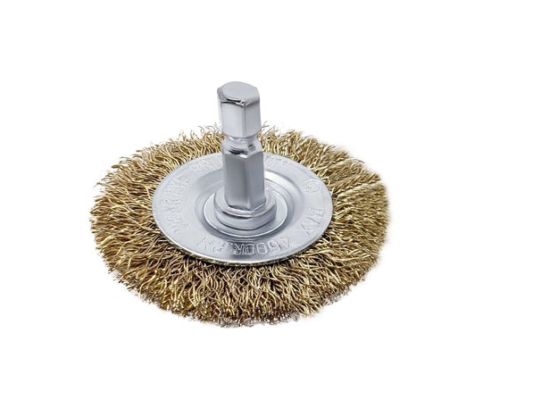 1" Wire End Brush on 1/4" Hex Shank - Brass-Coated Steel Bristle