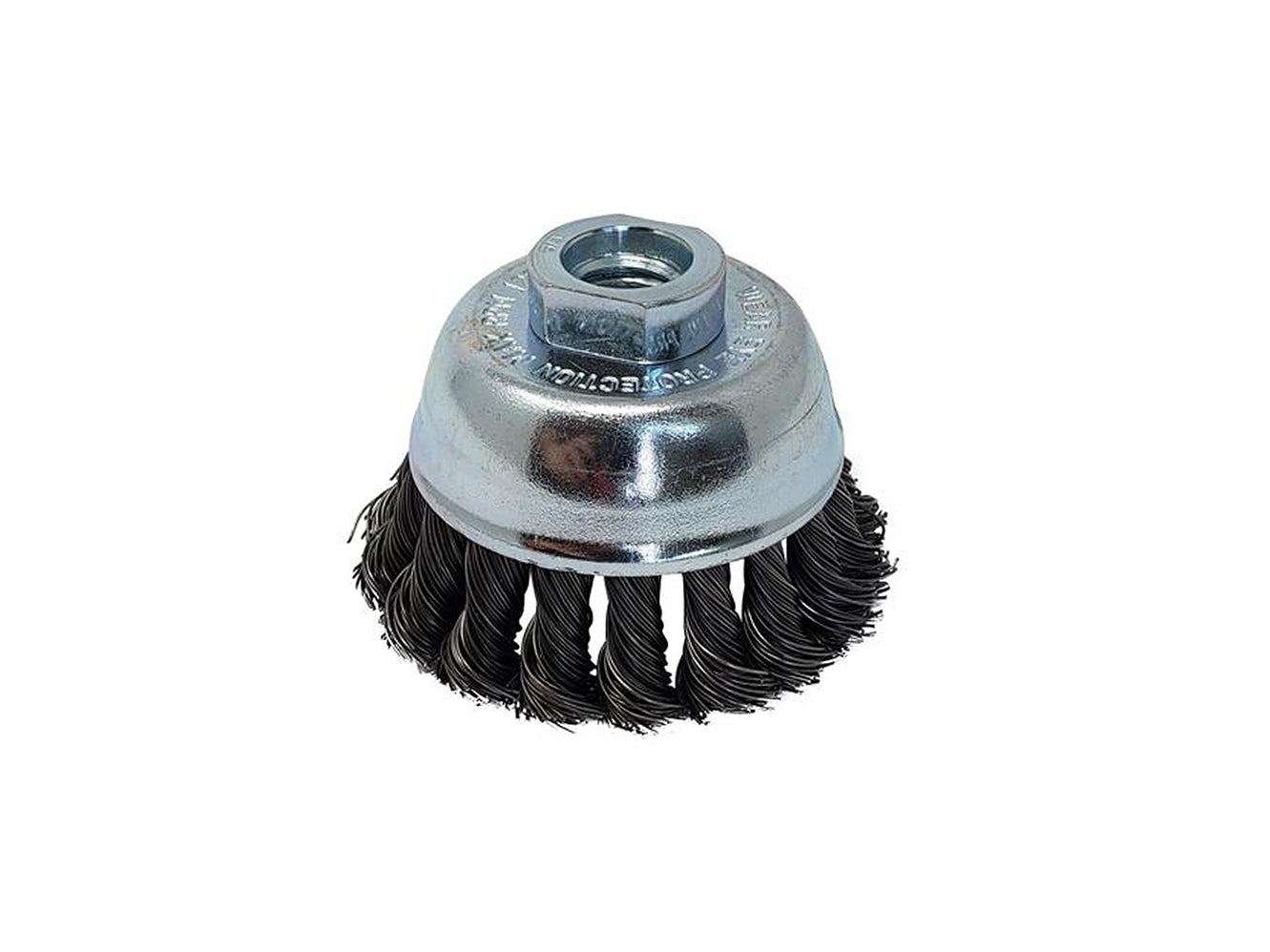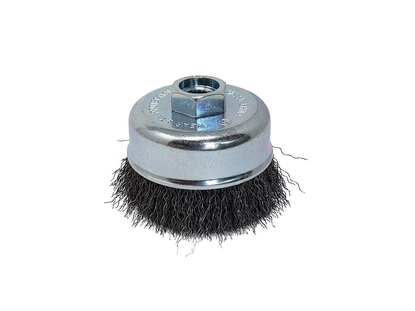 The Crimped Wire Cup Brush results in a smoother polished look of your surfaces:Â Ideal for larger surface prep tasks that require a more uniform finish, the crimped wire cup brush design has loose and flexible wires and is less aggressive than the knotted design but will result in a much smoother finish surface quickly and efficiently.