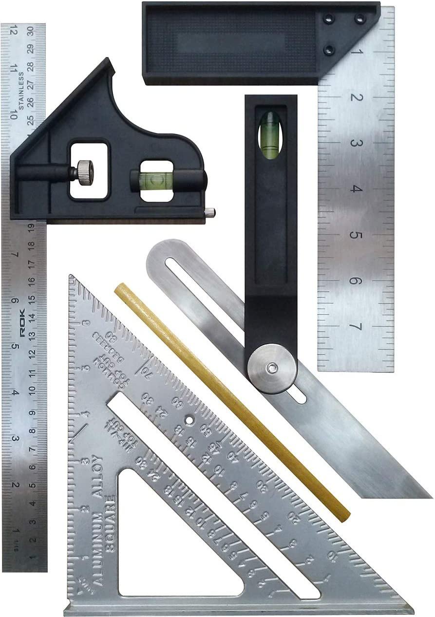 - Cinco herramientas de medición para usar en trabajos de carpintería o ebanistería y acabado fino, incluye escuadra combinada de 12" pulgadas, escuadra de ángulo rápido de 7" pulgadas, escuadra de prueba de 8" pulgadas, nivel en T deslizante y lápiz de carpintero