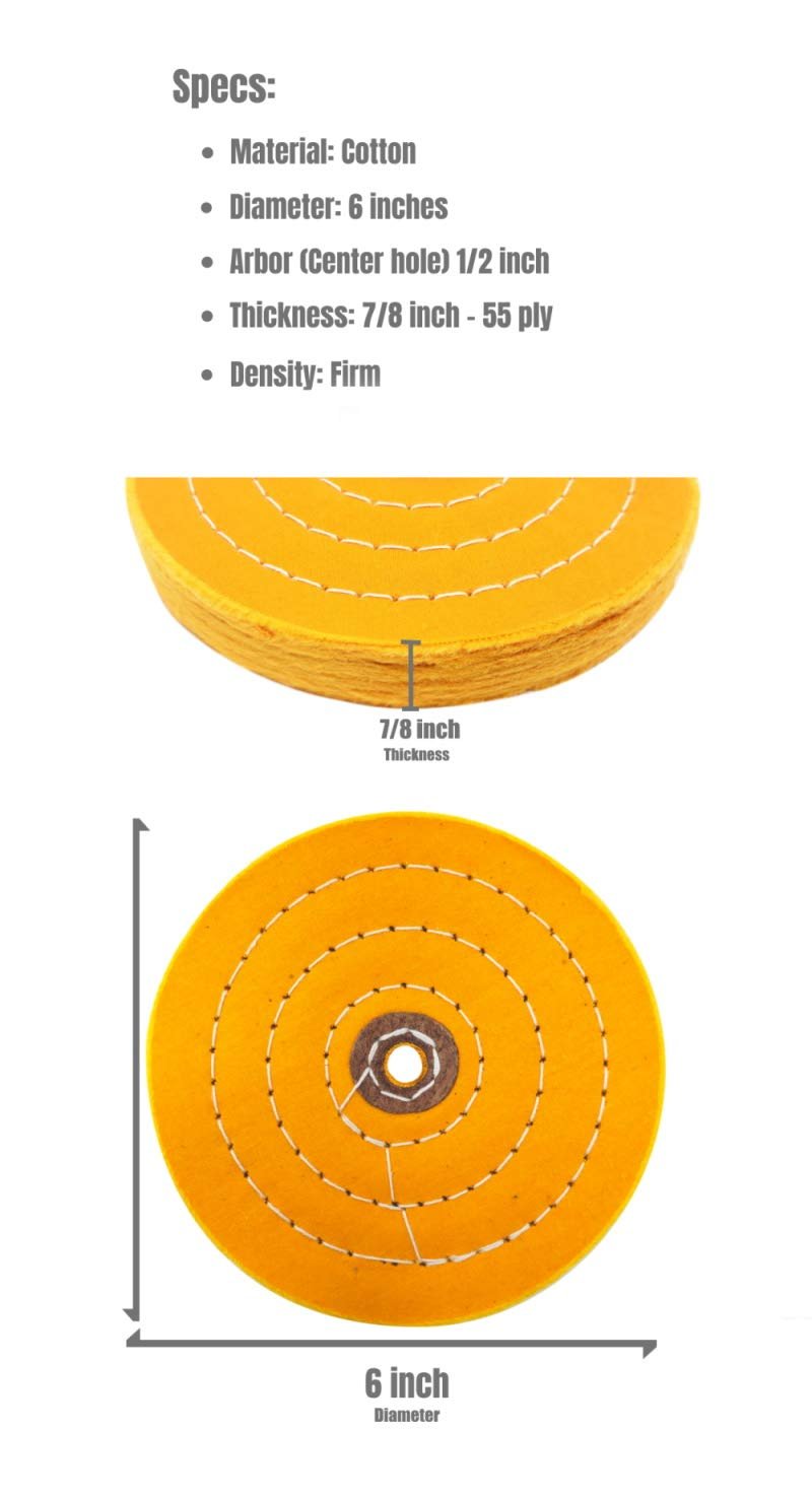 The package includes two-pack spiral sewen cotton buffing wheels, 6 inches in diameter, and features a 1/2 inch arbor hole, leather lines to withstand wear and tear, can be used with 1/2 inch arbor bench grinders or buffing machines.